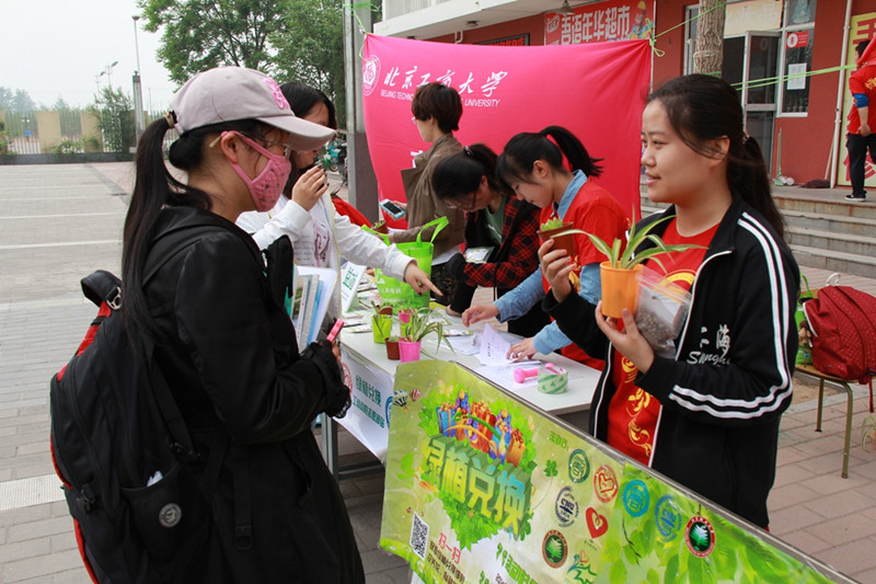 良乡校区、北京理工大学良乡校区、首都师范大学良乡校区三地开展环保宣传活动。此次“绿色兑换·绿阳盈窗”活动共分为两个部分:绿植兑换与结缘绿植。其中,第一部分为活动的主体,同学们以废旧塑料瓶与废纸为兑换载体兑换新鲜的绿色植物。第二部分,通过领养相同编号的绿色植物种子让三所大学的同学互相沟通,增进友谊。